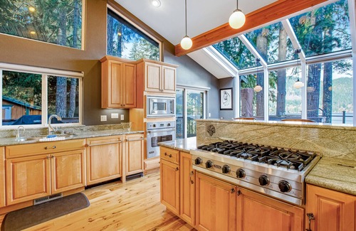 The gorgeous three-story house features an open living area with a wall of windows and a vaulted ceiling that blends right into the upscale, eat-in kitchen. Prepare gourmet meals using the Viking Professional Series appliances, including a six-burner gas cooktop, true convection oven, and microwave. A walk-in pantry offers a perfect place for extra prep and presentation work with additional counter space and an extra sink. Your gracious homeowners provide both traditional and hard-to-find herbs and spices as well as kitchen staples and condiments. The unique glass-paneled ceiling above the kitchen table reveals vertical views of towering trees.
