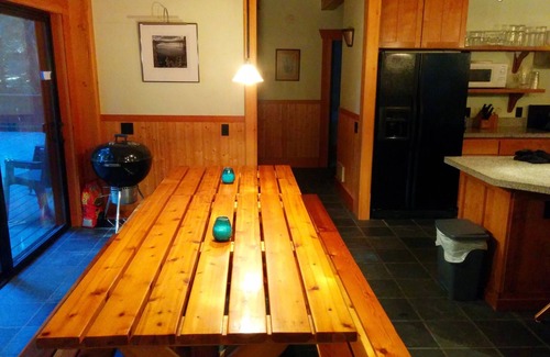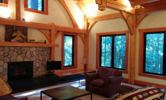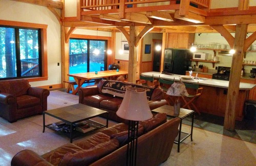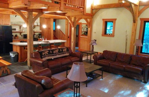 This gorgeous 6 bedroom timber frame cabin was built 10 years ago to the highest standards. The sound of the creek which runs within a few feet of the cabin provides a constant background of music. The great room has a 26 foot pine clad cathedral ceiling and an enormous stone fireplace, with comfortable leather sofas and additional seating. The kitchen and all 3 bathrooms have granite counters with slate floors. The kitchen has been designed to accommodate groups who like to prepare meals together with ample counter space for several cooks, and is fully equipped with a large fridge freezer and external ice/water dispenser, microwave, gas stove/electric oven, coffee grinder and maker, dishwasher and garbage disposal. Outside is an enormous deck with lounge chairs and barbeque. Twelve adults can dine at the custom built tables, with additional seating at the kitchen island.