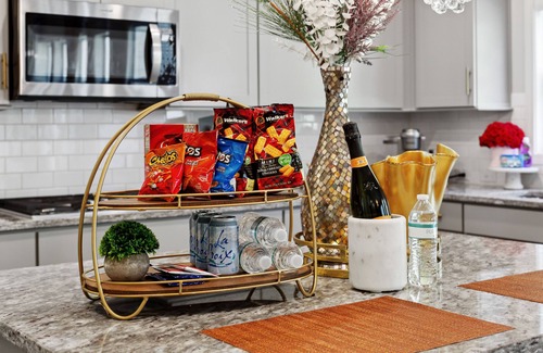 Let your imagination take a tour in our Luxury Crème De La Crème. First, you will encounter a chic office with gold ceiling and drop-down drum chandelier. Right across the hall you will encounter an exquisite dining room that features a beautiful marble table that seats 6 comfortably, with a raindrop rectangular chandelier. The living room is graciously designed with hues of cream, black and gold. The living room also features a marble pattern wall and rug with lush velvet curtains and an oversized crystal chandelier. Our gas fire place is also fully functional and great for the colder days coming upon us.