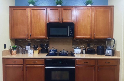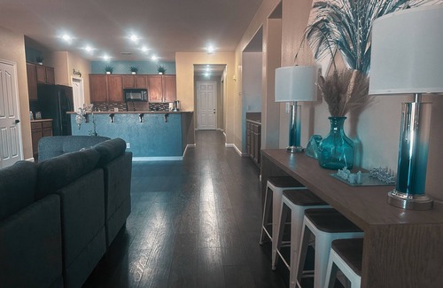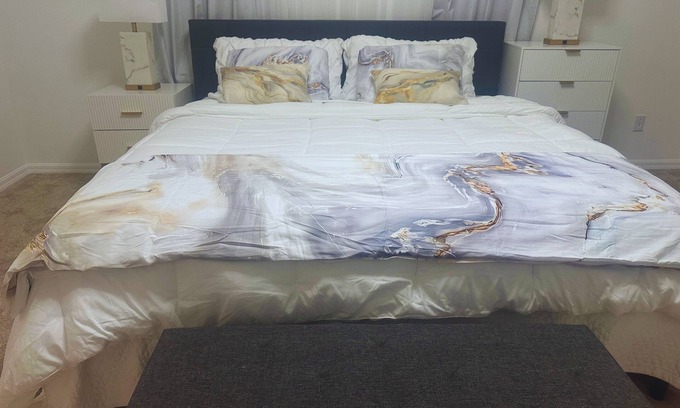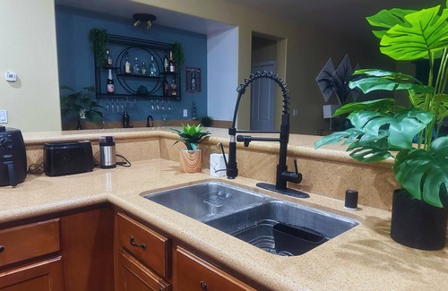 Discover this spacious Master bedroom in Pahrump. Nestled in a serene neighborhood, this wonderful house offers a cozy retreat for guests. The bedroom features a quaint king bed, ensuring a restful night's sleep. Immerse yourself in the tranquil ambiance as you soak in the jetted bathtub. Stay connected with WiFi and enjoy the convenience of a washing machine. Need to stay active? Take advantage of the fitness room. Our place is equipped for both long or short stays to make your holiday one to remember.