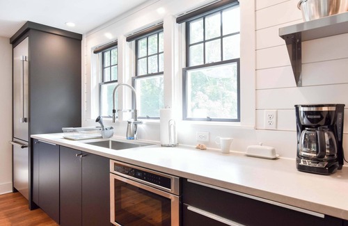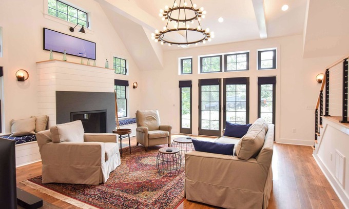 Everyone is bound to love their sleeping quarters! Each of the three bedrooms has its own bathroom. One of the two bedrooms on the first floor features a queen bed and a luxurious en suite bathroom with a walk-in shower and a separate tub; the second bedroom has two stylish Jenny Lind beds, plus an en-suite bathroom with a walk-in shower. The home also boasts a dedicated laundry room and another half bath on the first floor.The master suite takes up the whole second floor and includes a queen bed and en suite bathroom with a double vanity and a walk-in shower.