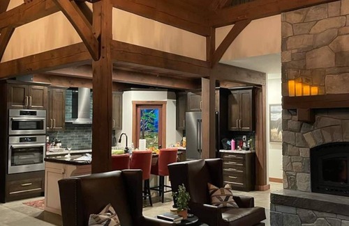 As you step into the home, you'll be awed by the grandeur of the open-concept living area, with high ceilings, gorgeous chandeliers, and stunning floor-to-ceiling windows showcasing the breathtaking mountain and lake views. The living room features comfortable designer furniture and a cozy wood burning fireplace, perfect for relaxing with family and friends.
