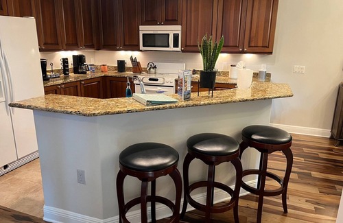 Reason #3: Our condominium is immaculate and beautifully appointed, not the standard boring “hotel package or less” other units settled for. Our condo screams relaxation! The kitchen has beautiful granite counters, cherry cabinets, and is fully equipped with everything you would need. For coffee lovers we offer both Keurig and 12 cup coffee brewer.