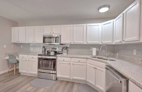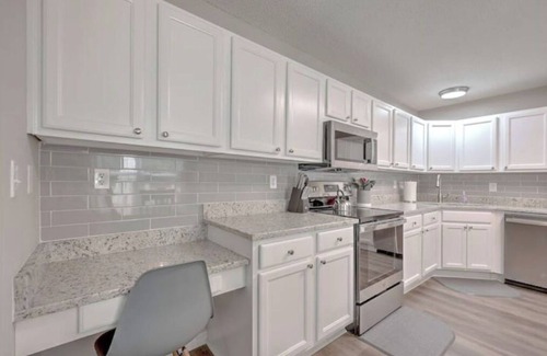 The kitchen is fully equipped with brand-new appliances, new countertops, a full set of cookware, dishes, utensils, and many other additions. (please see pictures.) Coffee and tea also provided.