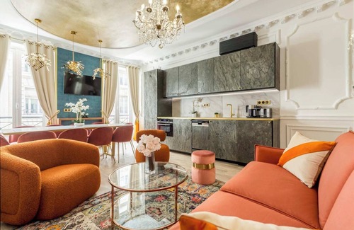Located in a central and prestigious area of Paris, this elegant apartment offers an ideal setting for a Parisian stay. Situated just a few minutes away from iconic attractions such as The Louvre, the Opera, and Place de la Concorde, the apartment combines historic grandeur with contemporary design. The unique design, crafted by a renowned French architect, features a large living room area, dining space with seating for ten, and a fully equipped kitchen. The colorful touches throughout the apartment create a lively and welcoming atmosphere.