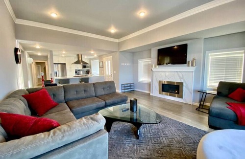 This tastefully renovated Tacoma property features high-end amenities and a modern vibe. Enjoy a bottle of wine (from the tasting room only blocks away) in front of the gas fireplace. Socialize with guests and enjoy the view while cooking in the well-appointed kitchen with stainless appliances and quartz counters. Enjoy the full en-suite bathrooms, flat screen televisions, full capacity washer and dryer, and comfortable sleeping space for six guest with a king bed in the front master, queen in the back master, and a surprisingly comfortable full-size hideaway bed in the living room couch.