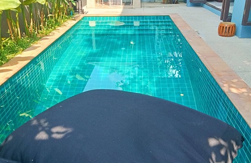 As you enter the villa, you'll be greeted by a private pool glistening under the warm Thai sun, inviting you to take a refreshing dip at any time of the day. The pool area is surrounded by a lush tropical garden, adorned with vibrant flora and swaying plumeria trees, creating a serene and captivating ambiance.