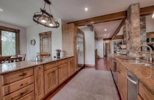After a busy day enjoying all of what Summit County has to offer, this private, airy-mountain home provides several comfortable gathering spaces surrounded by views of the mountains and aspen trees. When you enter the home from the oversized 3-car heated garage, you will find a full bathroom, laundry room and living space with views of Keystone, a television, fireplace, and a comfortable sectional! As you make your way up the staircase, the grand main living area is the perfect place to meet up and enjoy a cozy fire surrounded with superb stone and wood finishes all while gazing out at Buffalo Mountain. This main living area provides plenty of seating, a television, and floor-to-ceiling views of Buffalo and Red Mountain. Overlooking the main living area, is a spacious private deck with a gas grill, a 7- person hot tub and outdoor seating. To the right of the living area, you will find the kitchen and dining room. The spacious, gourmet kitchen is newly stocked with all essentials to prepare meals for your guests. Dining table seats 10, island seats 4, and kitchen nook table seats 6. Stocked with pots and pans, dish-ware, cooking pans, oil and spices - this kitchen makes cooking a pleasure and a family affair!
