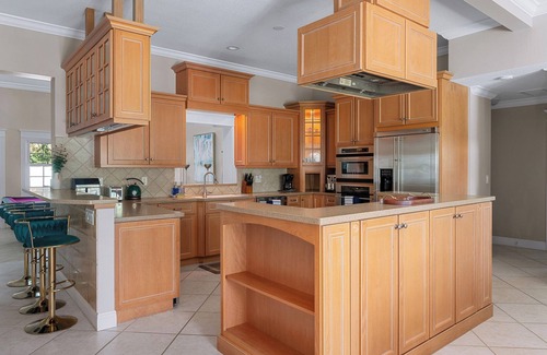 Additionally, our kitchen boasts a marble countertop island, with 8 barstools and a window overlooking the main entrance, where the pool/billiard table is located.