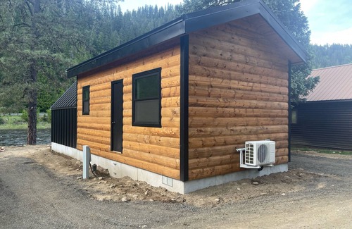 Located at Three Rivers Resorts, nestled in the beautiful wildnerness of northwest Idaho, unwind at this delightful cabin. Nestled in the heart of nature, this brand new cabin offers a perfect escape for guests seeking tranquility and enjoying the wildness with class. The cabin features a comfortable bedroom with a plush king bed, ensuring a pleasant night's sleep. With heating, AC, and WiFi, you'll have all the essentials for a comfortable stay. The cabin also boasts a sleek kitchen area with a full size fridge and stove top, equipped with plenty of cabinet space for anything you need. The cabin offers all the amenities of the resort including a shared hot tub and pool.