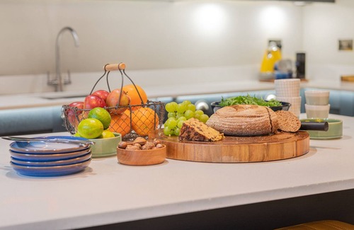 On entering the cottage, you are immediately greeted with a warm and welcoming entertaining space, the large open plan kitchen and living area offers stylish comfort, coupled with cottage charm. The generous island is the hub of the room, the perfect place for brunch or coffee and cake after a busy day exploring the coast. The kitchen area is well equipped, it includes washer/dryer, dishwasher and fridge and freezer, everything you could need for your perfect home from home.