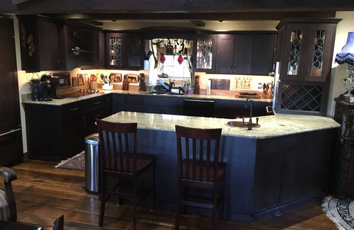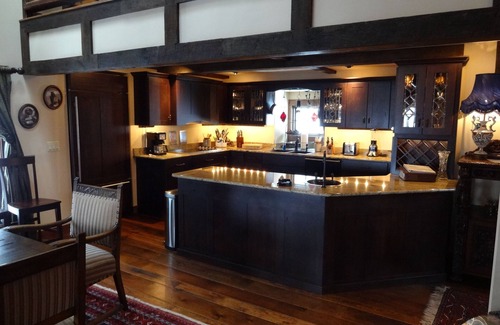 The interior of Voyager Rest is exquisitely finished with antiques and collectables from around the globe. It is truly one of a kind. It includes, a large stone wood-burning fireplace, oak beams, antique hardwood and slate flooring, stone showers, and granite counter-tops fitted with hand-made copper sinks. Two kayaks are available to guests; one at each lake (Please see orientation).