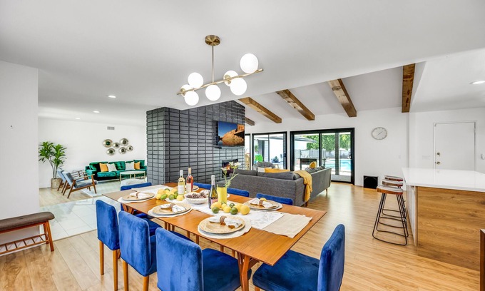 Spacious & Stylish: Two living rooms, open-concept kitchen, outdoor grill, dining table for 8 with string lights, pool, and jacuzzi.