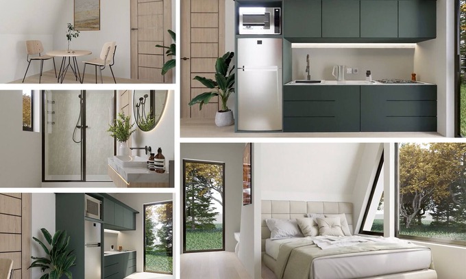Conveniently located on the grounds of Woods & Co wedding venue property, this modern 417 sq. ft studio-styled, A-frame cabin has full amenities. Built in 2025, this luxurious cabin features an open floor plan with a wall of windows overlooking the forested bluff land, TV, a full kitchen, private bath with walk-in shower, and private porch with furniture for your morning coffee. A lofted perch houses a queen bed for extra guests. All this quiet serenity is only 100 yards to the front doors of the Woods & Co wedding venue and about 2 miles to the Hidden Meadow & Barn wedding venue.