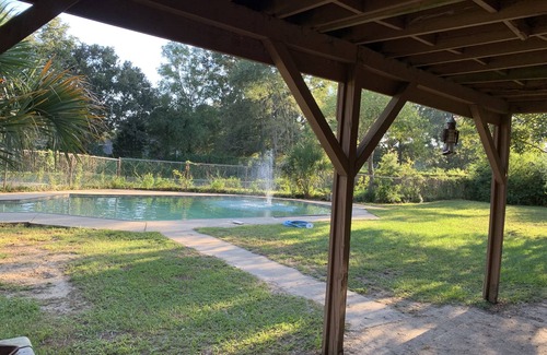 Most importantly at this time of virus contamination/travel worries… We are in the suburbs! The population density here is one person per 50,000 ft.² as opposed to 100 people in downtown Pensacola or 250 people on Pensacola Beach or 750 people in Destin or Gulf Shores! Yes we have bugs! But also birds chirping, ducks and geese quacking, dogs barking, a neighbor a mile away flying his model plane, and someone a few miles away getting a new roof installed but, sitting in the front yard gazebo, you hear all this plus the sound of water spattering from the pool fountain in the backyard! And no traffic noise or blaring the radios! This IS life at the end of a rainbow! Relax and enjoy the day then participate in our +E entertainment program in the evenings!