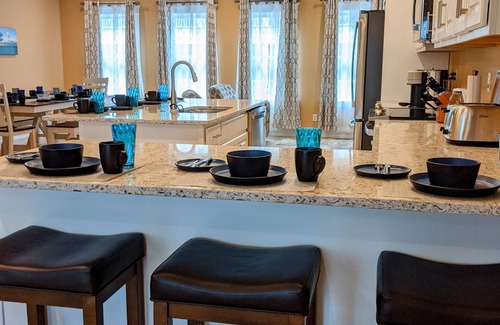 Welcome to our beautiful new in 2021 luxury townhouse with 5 bedrooms and 5.5 bathrooms on OCMD's exclusive Sunset Island, a safe and guarded resort style community. This 12-person max occupancy family friendly home features a relaxing 1st floor porch and 2 large sunrise facing balconies with plenty of seating for lounging and entertaining. In addition, the house boasts a large kitchen with high end amenities opening to a dining room, sitting area and huge living room. The third floor hosts an ensuite master suite with a comfortable king size bed and two separate ensuite bedrooms with queen size beds. The 4th floor boasts an enormous game and media room complete with foosball, 100” 4k gaming projector, arcade machine along with a twin bed/trundle and a pullout queen sofa bed. Finally, each room and floor are decorated and furnished with contemporary and traditional décor along with beach themed 3D murals for serene ambience.