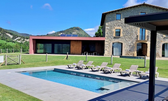 In the region of Plana de Vic is the holiday home CASA CANÉ DE VIC situated - just 5 km from the beautiful town centre of Vic. The house, which has room for 22(+7) persons, has just been reconditioned in 2011 and is now a unique holiday home of very high standards. The house has 9 bedrooms – each with a bathroom of their own. Furthermore, the house has three floors. On the second floor there is an extremely delicious spa area with Jacuzzi and sun beds, which makes the perfect the perfect chill area.