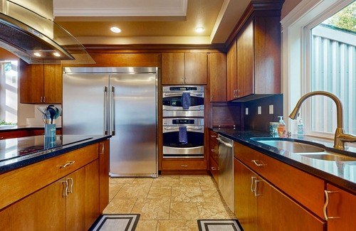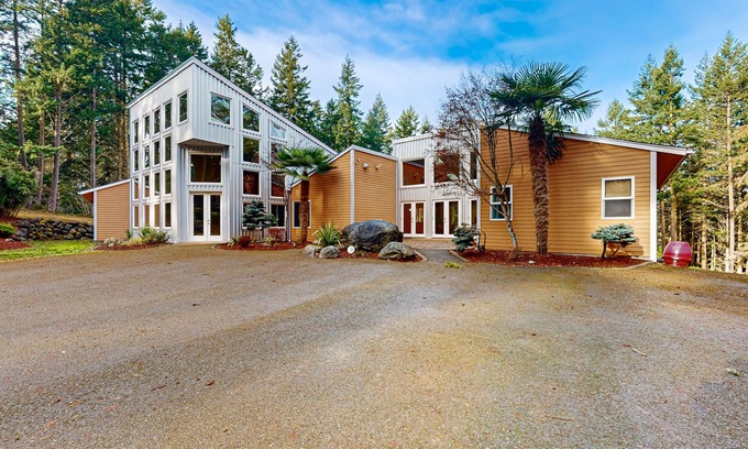 If you're coming to Sequim for a getaway, indulge in this spectacular vacation home featuring a private hot tub, movie theater, fitness room, and pond. Stately and imposing, this home stands out with unique architecture and a profusion of windows. Pull into the driveway and take in the wooded surroundings. Then step inside and marvel at the pond surrounded by tropical greenery. Further inside, notice the distinctive decor and spaciousness. Relax in the living room on the stylish sofa, and bask in the natural light that filters in. Three sets of double glass doors open wide to create an open-air atmosphere. On chilly nights, warm up with a fire in the fireplace, which features a stainless steel facade.