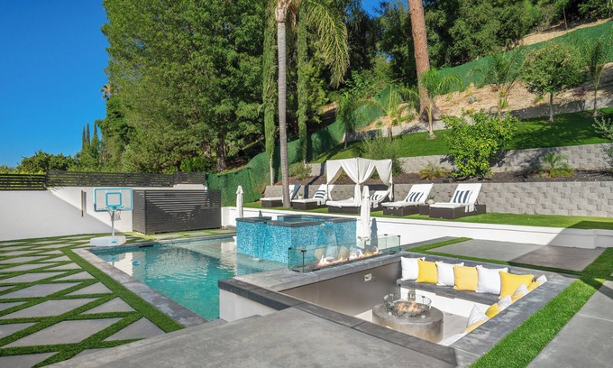 Welcome to one of the most epic house you've ever seen, located in the best area of Woodland Hills within the beautiful San Fernando Valley. Only 10 minutes drive from Westfield Topanga, shopping and restaurants area. This incredible property is a true oasis, featuring amenities that will make you feel like you're living in a luxury resort. The exterior of the property is stunning; you'll find a renovated pool surfaced with a jacuzzi, waterfalls, and a basketball area surrounded by sunbeds. The BBQ patio is fully equipped. The large yard is completely landscaped, including a shaded area with a dining table, cushion seating set, coffee table, and TV. The entire pool area is surrounded by state-of-the-art sound equipment, making the outdoor space ideal for hosting unforgettable gatherings.