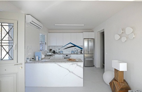 Upper level (pool level) : A living room with large windows overlooking the port of Kea. a dining area and fully equipped kitchen. Leading off the living room there is a guest w.c.with a shower and a master bedroom (queen size bed), with an office area and an en-suite bathroom with a rain shower.