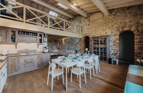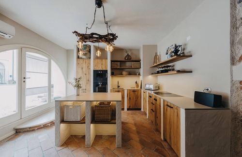 - Cantina vaulted cellar with 4.5m long old wood table for dining with 12-14 people. Professionally equipped kitchen in Mediterranean style.