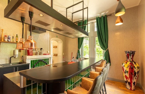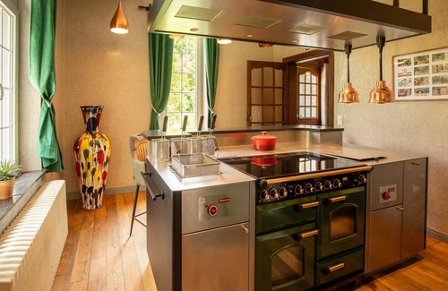 The kitchen consists of a newly equipped kitchen with cooking island where, while enjoying an aperitif, you can cook together, a pantry with dishwasher, extra oven, extra refrigerator, plenty of storage space for dishes and cutlery and in the basement a cold room so there is certainly enough space for cooling drinks and food.