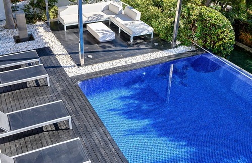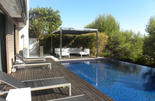 This spacious design villa was build in 2006 and is in perfect condition. The view is spectacular, 180 degrees view of Sitges and the sea. Every room is the house is looking great, with a lot of attention to detail. The villa has 4 bedrooms, of which 3 bedrooms are overlooking the pool. The 4th bedroom, the master bedroom is on the first floor and also has a great view. All bedrooms have airconditioning, wifi cable, kingsize beds and big build in closets. There are 3 bathrooms of which 2 with bath. There are are several terraces and a lounge area with couches near the infinity pool.The TV room has a big TV, with national and international channels and a Playstation 3. The living room has 5 meter high windows and has a view of Sitges and the sea. The house has fast internet (Fibra) and a kitchen with every appliance that you can imagine. Also a nespresso machine. The house is located in a beautiful residential area (Vallpineda) and is located near the center of Sitges. The residential area is a gated community with parking space in front of the house.