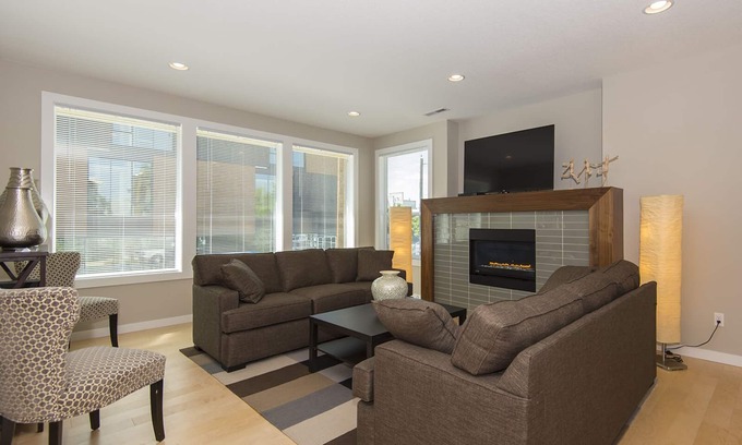 This modern, contemporary home was built five years ago and features an open main floor layout, conducive to entertaining, with the added benefit of a private office on the main floor, as well a half bathroom. The kitchen is well stocked with high end appliances and even things like a crock pot. We provide white on white plates and more , with 18 of each, so you don’t need to run dishes after each meal! The gas pebble fireplace makes for a cozy retreat on cold winters days, nestled between the two living couches. Alternatively, in the summer heat, we have central air conditioning throughout the house.