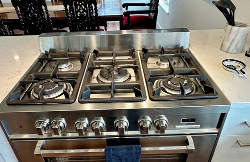 The open kitchen includes a 5-burner Italian range, 2 sinks, marble counters, and expansive island where everyone can participate in cooking, and more fully equipted than 99% of the vacation rentals on the market. We even have a fully stocked spice drawer.