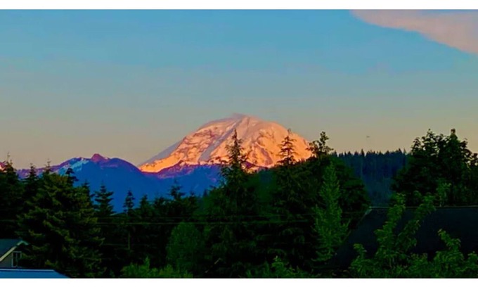 Peaceful Mt Rainier View home close to skiing & hiking. Modern amenities: large chef’s kitchen w/ Italian range & marble counters, 2 master suites w/TVs, 75” TV in great room, Sonos throughout, heated floors in master baths, expansive windows in serene great room, heated outdoor dining & living areas, new 6 person spa, RV parking with 50 amp power, humming birds, deer, Elk, bald eagles. 5-min walk to white river, 10 min walk to downtown Buckley.