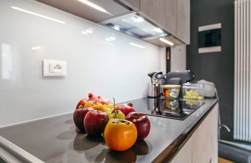 The modern kitchen is fully equipped and consists of 4 induction plates, fridge with freezer, microwave oven, capsules coffee machine, kettle, dishwasher.
