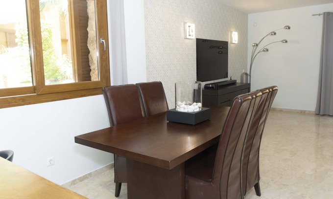 Luxury 2 bedroom, 2 bathroom apartment with every comfort of home including A/C and heating, Large corner reclining leather sofa, Fibre optic internet, 55" Samsung smart TV with British channels and Netflix account included, surround sound system, Nespresso coffee machine, dishwasher, washing machine, walk in shower and hairdryer. The apartment is situated on the ground floor overlooking a large pool with a large balcony and is ideal for disabled guests as there are no stairs.