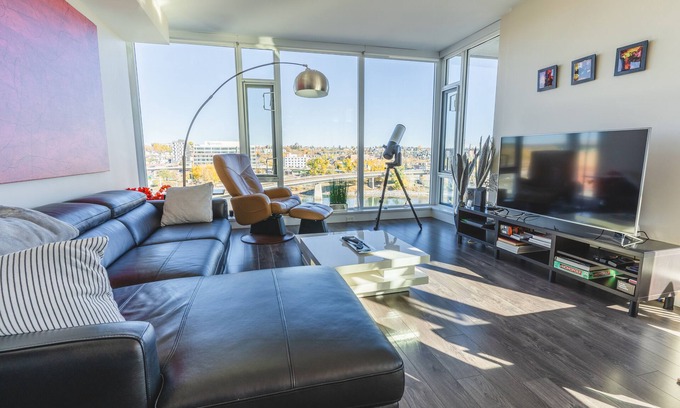 Luxury 2-bedroom condo nestled in the vibrant heart of Calgary's East Village is located in East Village. Luxury 2-bedroom condo nestled in the vibrant heart of Calgary's East Village provides accommodation, featuring Air Conditioner, Parking, Entertainment, among other amenities. This Apartment features Air Conditioner, Parking, Entertainment, to make your stay a comfortable one.