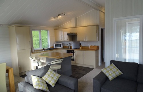 Two bedroom lodge, with one double bedroom with large en-suite shower room and one twin bedroom. A separate bathroom with bath/shower. The open plan kitchen/dining room is fully equipped with a dishwasher, washing machine/tumble dryer, fridge freezer, microwave, electric oven and hob. Full central heating. The lounge has a 40" television and a wall mounted fire. Outside Decking and car parking beside lodge. Colour schemes may vary slightly between lodges.