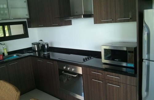 This is a spacious 3 bedroom, 2 bathroom pool villa for rent in a very nice development with other similar, high quality homes. The exterior consists of a manicured tropical garden, a saltwater infinity edge swimming pool, a large, covered terrace for dining and relaxing and a covered carport. The interior space consists of an open plan living room, dining room, kitchen with 3 double bedrooms. The master bedroom has an ensuite with shower and bathtub. The kitchen has all modern amenities and appliances including Nescafe Dolce Gusto pods and comes with a 'Welcome pack' of essentials to get you going. There is a separate laundry with washing machine and plenty of storage and the villa has wireless internet connection, bluetooth speaker to connect to your phone for music and access to satellite TV.