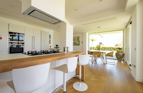 To the left, a welcoming open living and dining space, comprising a cosy lounge area with a comfy sofa. In addition, there is Smart TV and office with fireplace area. Next to this you will find a fully-equipped kitchen. On the same floor, divided by a door, there is access to a bathroom, the laundry room and continuing to the SPA area, including a steam room (for 5 people) and a large emotional shower. The entire floor is illuminated by large windows, overlooking the garden, direct access to the outdoor sitting area and pool.