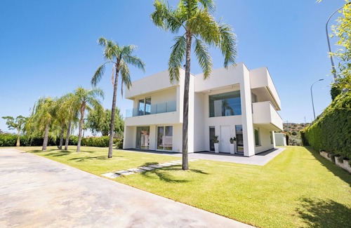 The first floor is accessed via an impressive modern hallway and glass staircase situated centrally. A corridor leads to the three double bedrooms; A master bedroom, with a king size bed with its own sleek en-suite with a shower and bath, walk-in wardrobe and direct access to the shared terrace admiring stunning sea views of the Aeolian Islands and a sitting area. A bedroom, with a king size bed with its own sleek en-suite shower room and direct access to the shared terrace. Finally the last bedroom , with a king size bed with its own sleek en-suite shower room.The villa is able to comfortably host 6 adults.