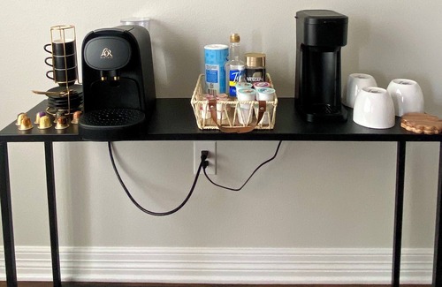 The spotless kitchen is stocked with dishes, pots, pans, Kitchenaid mixer, air fryer, griddle, toaster, spices, new appliances, and a coffee station with Keurig and Nespresso machines.