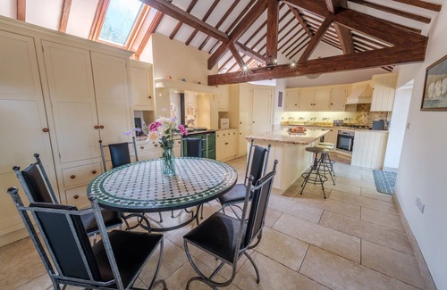 LIVING The Piggeries cottage possesses a very special charm and is feature rich. The cottage underwent a major transformation to form a large property with four en-suite bedrooms that can sleep up to 10 guests. The kitchen is a delight to cook in and provides a great social area for guests. It has a huge, fully-fitted, hand-painted Mark Wilkinson kitchen, equipped with a green Aga, gas hob, oven, dishwasher, full-size fridge and freezer, granite work surfaces, island unit, seating and French doors leading into the garden. An orangery-style dining room has been added, with a feature glass ceiling and large picture windows looking out into the garden. The dining table seats twelve. A few steps lead down into a huge new living room with a grand stone fireplace and a wood-burning stove. Large picture windows and French doors lead to the conservatory which has folding glass doors that can be opened fully to provide access to the patio and private, landscaped garden areas.