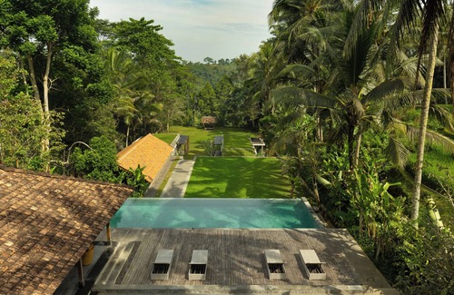 Hidden from the bustle of Ubud, amidst a pure Balinese village setting, this 6-bedroom villa retreat offers everything required for a tranquil holiday in Bali. Settled amongst coconut groves and rice paddies, the architecture features stepped levels that harmonize with the surrounding cascading rice terraces. It boasts a vast tropical garden, a lap pool, an open-air Joglo for dining, a hot tub jacuzzi, and a gym.