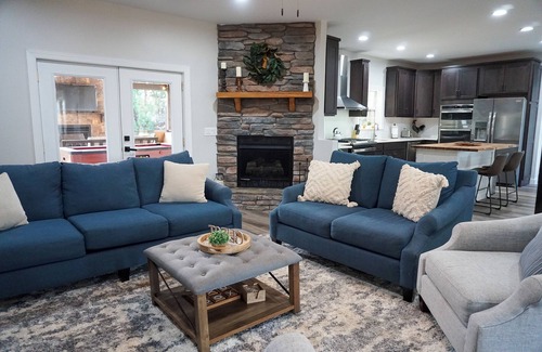 Perfectly nestled between Tryon Equestrian Center & Lake Lure, this 5,000 sqft, 15-acre ranch offers the ultimate equestrian retreat. Bring your horses to the two-stall stable and enjoy a spacious, upscale home with a game room (shuffleboard, foosball), wet bar, and entertainment center. Relax on the deck by a peaceful river and waterfall. Perfect for groups, this luxury ranch combines comfort, tranquility, and proximity to world-class equestrian facilities.