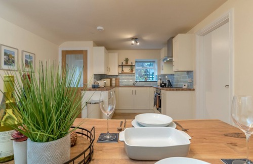 Downstairs at this luxury accommodation in an old turbine house in Betws-y-Coed you'll find a bright open plan living space. There is an extremely smart and very well equipped kitchen complete with an electric hob and oven, and a modern oak dining table.
