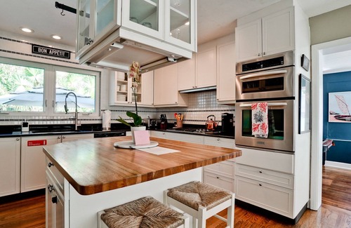 The kitchen/dining space offers a built-in gas range, stainless appliances & a custom island. Off the kitchen is a gorgeous remodeled 1/2 bath for all guests' use.