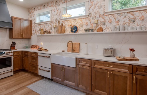 -Stunning quartz backsplash, farmhouse sink, and local decor accents