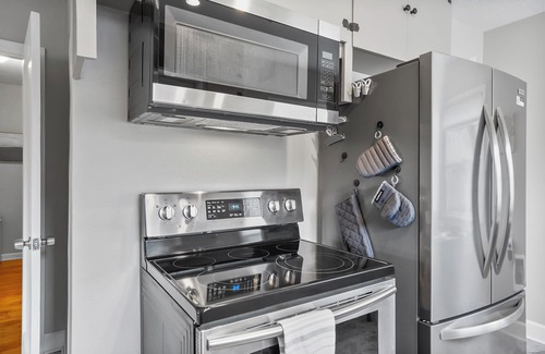 The living room is fully furnished and features a comfortable couch, coffee table, fireplace, and a large smart TV all offering perfect entertainment options for your stay. The kitchen has brand-new stainless steel appliances, including a full-sized fridge, stove, oven, microwave, dishwasher and disposal. The spacious countertops allow you to prepare your meals quickly, and the eat-in-kitchen comes with a dining table to enjoy your meals comfortably.