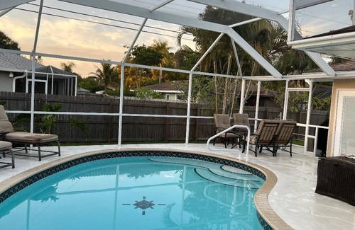 Enjoy your relaxing and peaceful fully heated pool home located in a very quiet neighborhood of Venice, one of the great undiscovered gems of southwest Florida. With three bedrooms and four beds this house is perfect for your family vacation getaway. The master bedroom features a king sized bed, fully updated bathroom with huge walk in shower, and doors that give you your own private access to the pool. The cozy second bedroom features a queen bed, and shared full bathroom with a third bedroom that features two single beds.