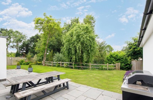 Garden with BBQ, outdoor seating, sun loungers and ample space for children to play.