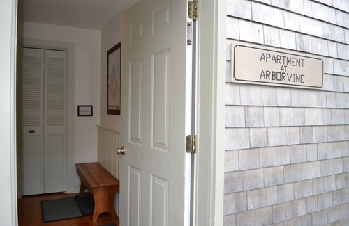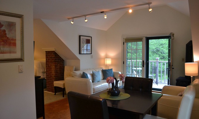 Newly remodeled, second floor, one bedroom apartment located in the heart of historic Blue Hill and Downeast Maine. This gorgeous apartment sleeps 2, has a gas fireplace,new bamboo, cork, tile, and carpeted floors, free wireless Internet and flat screen HD cable TV and a private balcony overlooking the back gardens, grapevines, and forest. Enjoy looking at the stars or waking with the sun on your Queen size bed under the sky light. You are just a short walk from beautiful Blue Hill Village, with its many shops, restaurants, galleries, beaches, town park, and hiking trails. Blue Hill is centrally located between Acadia National Park/ Bar Harbor, Stonington/Deer Isle, Ellsworth and Bangor. Enjoy cooking in your fully equipped gourmet’s kitchen or join us at one of our 2 on site restaurants: The Arborvine, with award winning fine dining; or DeepWater Brew Pub, a casual brew pub serving our very own Micro-brewed Beer and freshly made pub fare with indoor & outdoor seating.