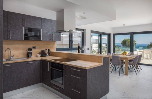 This 5-star accommodation will definitely amaze you with its comfort and modern arrangement. Luxury Apartment Nautica with Pool I is located on te ground floor and has also a fully equipped kitchen, living room, and dining area. From here you can exit to a huge private terrace which is equipped with deck chairs and offers a nice sea view. The swimming pool is heated and shared.