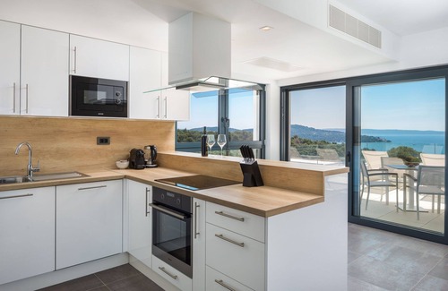 This 5-star accommodation will definitely amaze you with its comfort and modern arrangement. Luxury Apartment Nautica with Pool III is located on te second floor and has also a fully equipped kitchen, living room, and dining area. From here you can exit to the thirdprivate terrace offers you a beautifulsea view. The swimming pool is heated and shared.